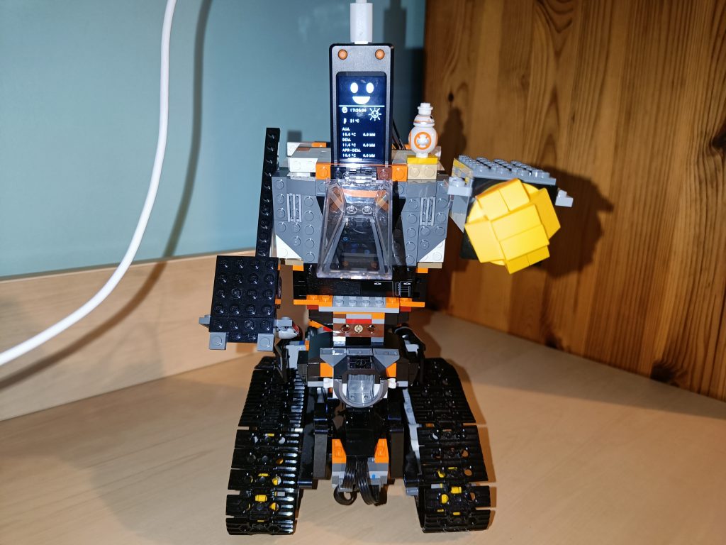 Ce robot est entièrement fait en Lego. Sa base vient d'un véhicule Lego technique d'autochenille. Il est équipé de 3 servomoteurs, 1 capteur de température et 2 boutons pour les différentes fonctions, qui ont été implémentés car les boutons de l'ESP n'étaient pas suffisants.