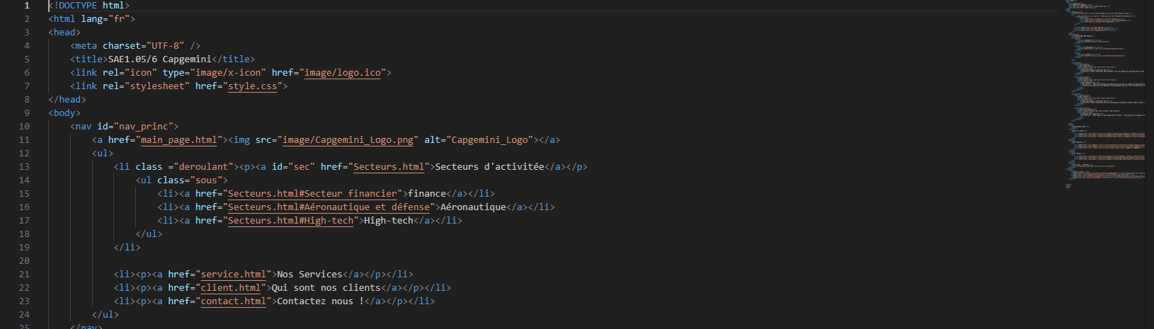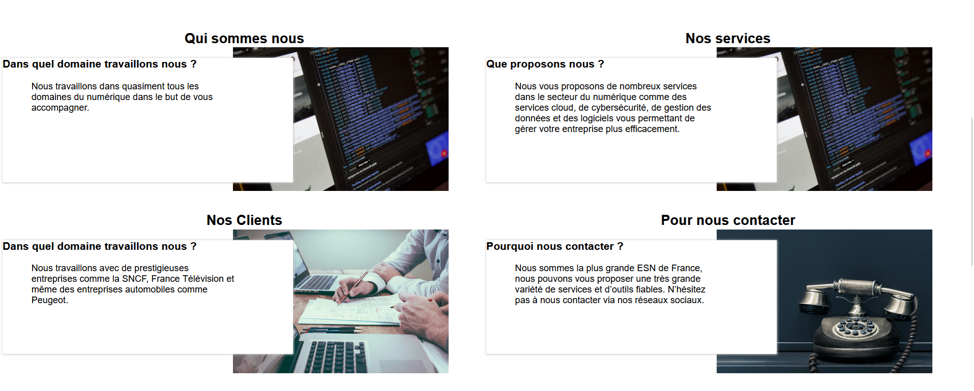 De mon côté j’ai réalisé la barre de navigation du site, le formulaire de contact et la page présentant les secteurs d’activité. J’ai aussi pu trouver une bonne manière de travailler avec mon groupe en séparant correctement le travail tout en gardant des bouts de codes créés par chacun qui se fusionneraient de manière simple. Chacun a donc fait l’HTML de ses pages et le CSS lié.