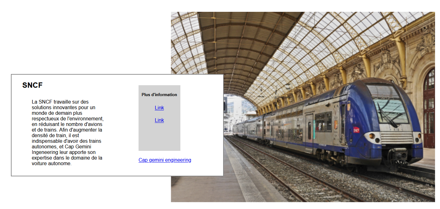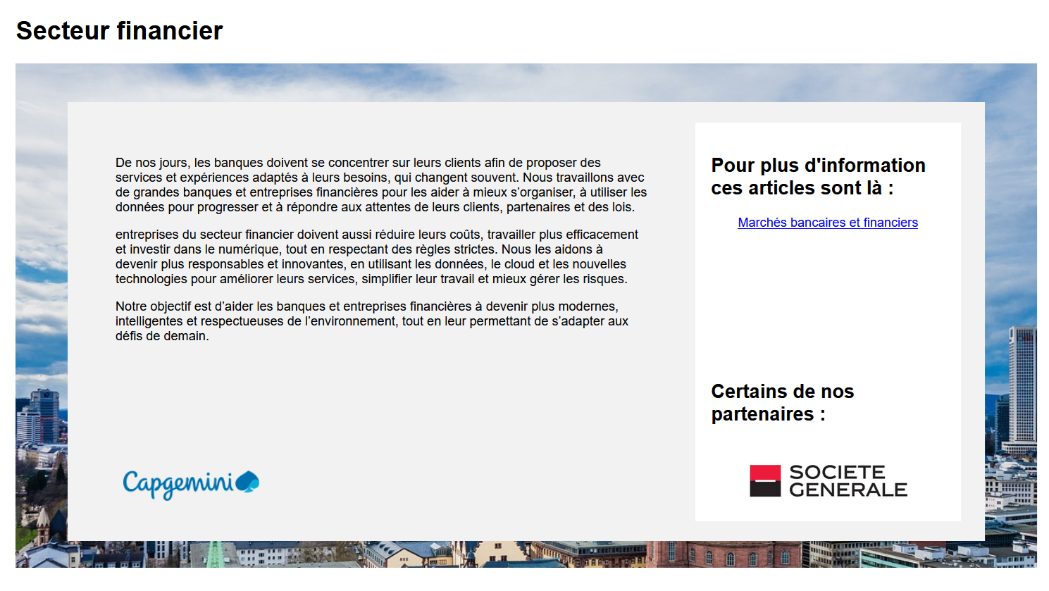 Cette page est composée d'articles parlant des différents "gros" clients avec une description de ce que fait l'entreprise pour ces clients, les solutions, les services proposés. On y trouve aussi des liens vers d'autres articles parlant de ces projets et un lien menant vers la filiale s'occupant de ce client.
