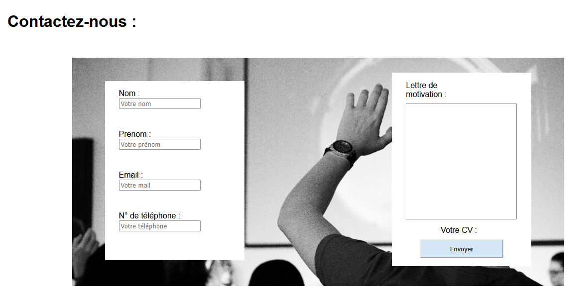 Ici les élèves peuvent entrer leurs informations : nom, prénom, email, numéro de téléphone, une lettre de motivation et envoyer leur CV. Le formulaire n'est pas réellement fonctionnel car, tout d'abord, le site n'est pas un site officiel de l'entreprise et aussi car à ce moment de mes études je n'avais pas encore commencé de cours pouvant m'expliquer comment faire.